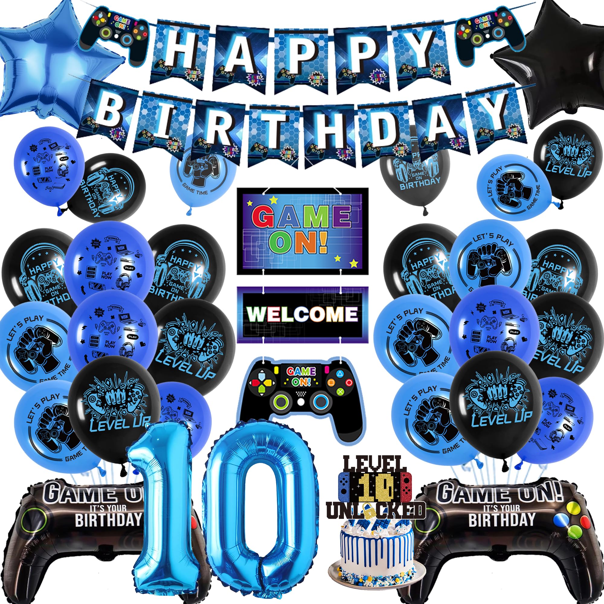 10th Birthday Banner Decorations Kids - Blue Double digits Gaming Party Decor Set with Controller Foil Balloons, Happy Birthday Banners Balloon Cake