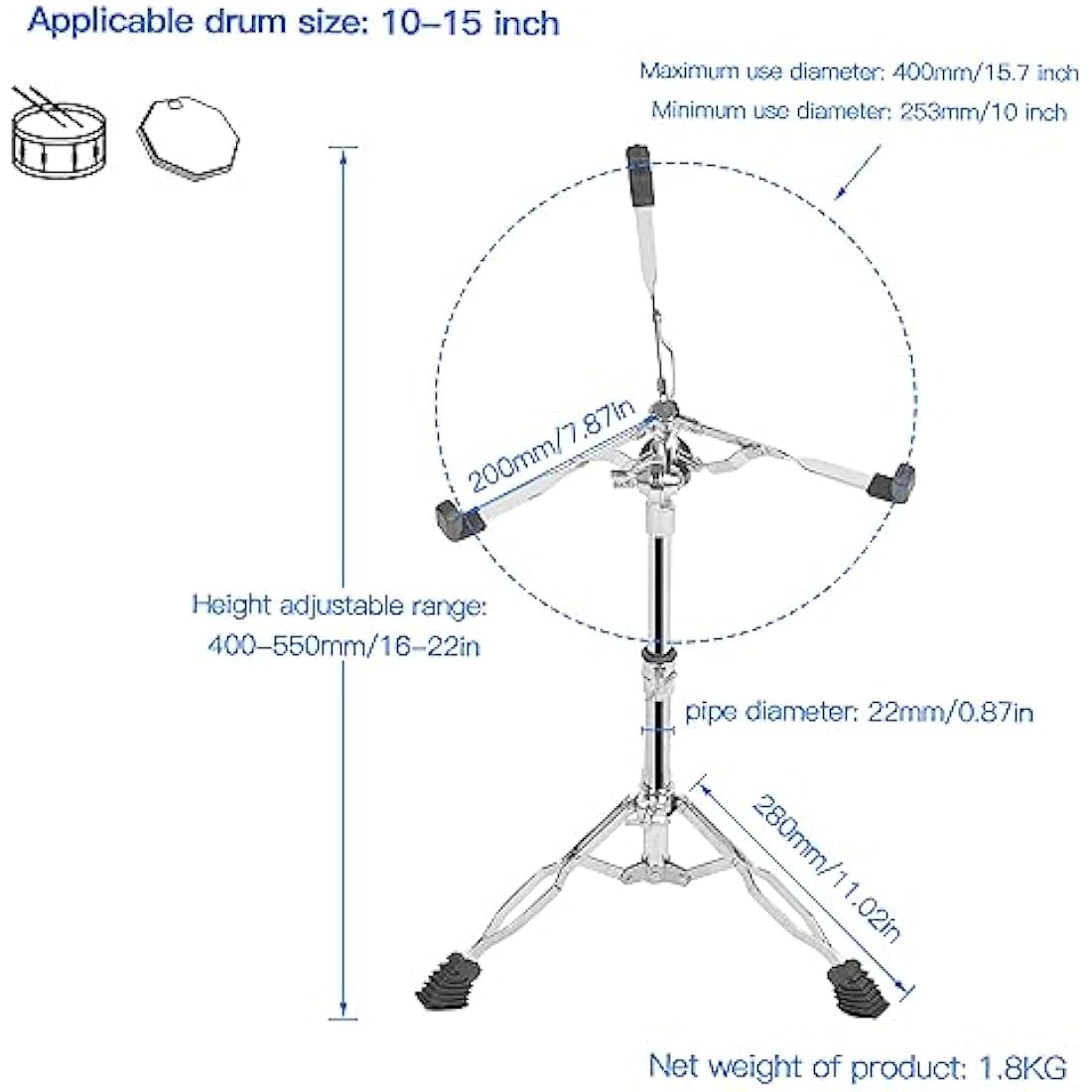 aleawol 10-15 Inch Snare Drum Stand, Double Braced Tripod Snare Stand Adjustable Height 16-22 Inch, Foldable Drum Pad Stand for Practice and Stage Performance