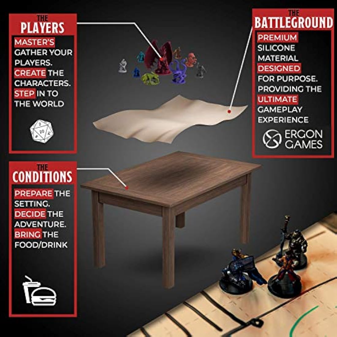 THE TRUE RPG MASTERS "PRIZED POSSESSION" - STILL SKETCHING grids right before the game like a newbie? Wasting everyone's time wishing your battle mat would just lay flat? Masterfully create the ULTIMATE GAMING EXPERIENCE and bring the fantasy alive with the GHOST-PROOF, SMEAR PROOF SILICONE table top role playing mat. SIMULTANEOUSLY PREDRAW TWO TERRAINS (1 per side) IN ADVANCE, then ROLL UP or FOLD UP for storage and travel. It INSTANTLY LAYS FLAT! ZERO waiting or "weighting" required! ANTI-SLIDE, GRAVITY FLAT SURFACE - TIRED OF STOPPING THE fights every time table bumps send miniatures flying across your dnd mat? Ergon Games offers the ONLY TRUE gravity flat technology battlemat that leverages a POWERFUL GRIPPY SURFACE, keeping PIECES SECURELY IN PLACE, regardless of how many times YOU KNOW WHO knocks the table. COMMAND EVERY RPG BATTLE - UNIVERSALLY COMPATIBLE and DOUBLE SIDED HEX/ 1" SQUARE surface lets you outwit your fellow journey folk at any game you choose, delivering unbridled CREATION DOMINATION space for wargaming, Dungeons and Dragons 5th edition, Pathfinder, Warhammer 40k, GURP, Mercs, Munchkin, Blood Bowl, Star Wars X Wing, tabletop multiplayer mmorpg minis figures, malifaux games, and other fantasy RPGS with or without roll dice. STAYS PRISTINE FOR 2+ MONTHS - PREPLAN & PREDRAW YOUR MAPS WITH EASE: While most Dungeons and Dragons mat models absorb hand oils, causing smeary smudges across your innovative terrain, or leave scrub-defying ghost stains after ink sits, this RPG mats unique silicone surface LOCKS IN GAME DRAWINGS FOR MONTHS, then QUICKLY WIPES CLEAN with AN ALCOHOL BASED WIPE (Baby/Kitchen) or OIL/SOAP-REMOVING BATH CLEANER (Non-abrasive). You can preplan and predraw your maps, terrains and dungeons with ease! MESSY FRIENDS? CRAZY KIDS? WE GUARANTEE this silicone mat outlasts, outwits and outperforms ALL vinyl game boards, laminated grid paper or whiteboard mats, or expect a prompt, friendly refund or replacement, whatever makes you happiest. Even your Cheetoh-fingered, dew spilling friends can't mess it up. So go ahead, show those other gamers you've taken your gaming to the next level and try it RISK FREE when you Click Add to Cart Now. (See simple care instructions in description).