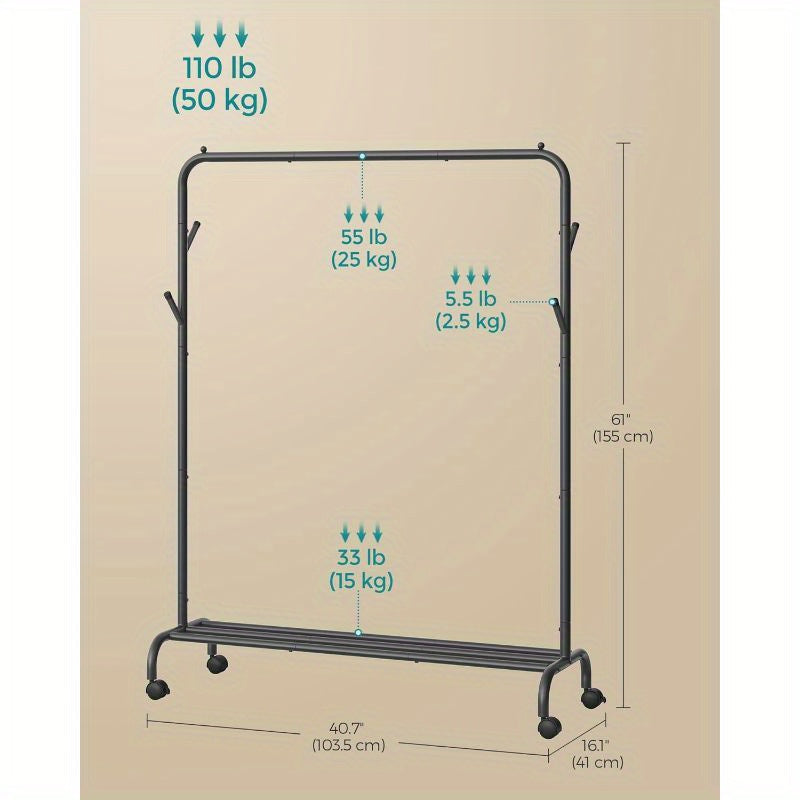 Clothes Rail, Clothes Rack, Single Clothes Hanging Rail, Heavy-Duty Metal Frame, with Wheels and Shelf, 50 kg Total Max. Load, 103. 5 cm Wide, Clothing Storage