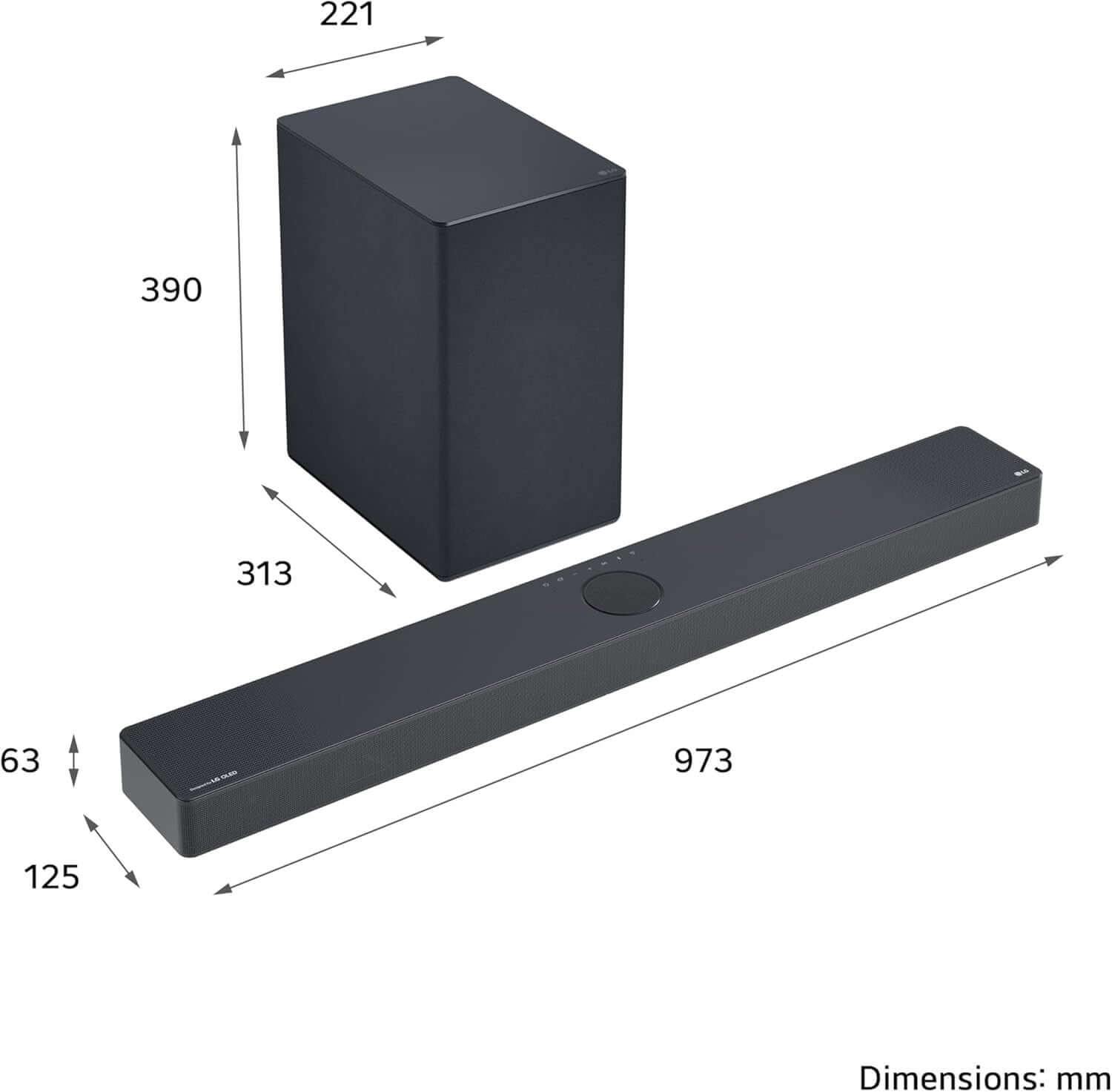 - Wireless subwoofer: 390 x 221 x 313 mm (H x W x D)