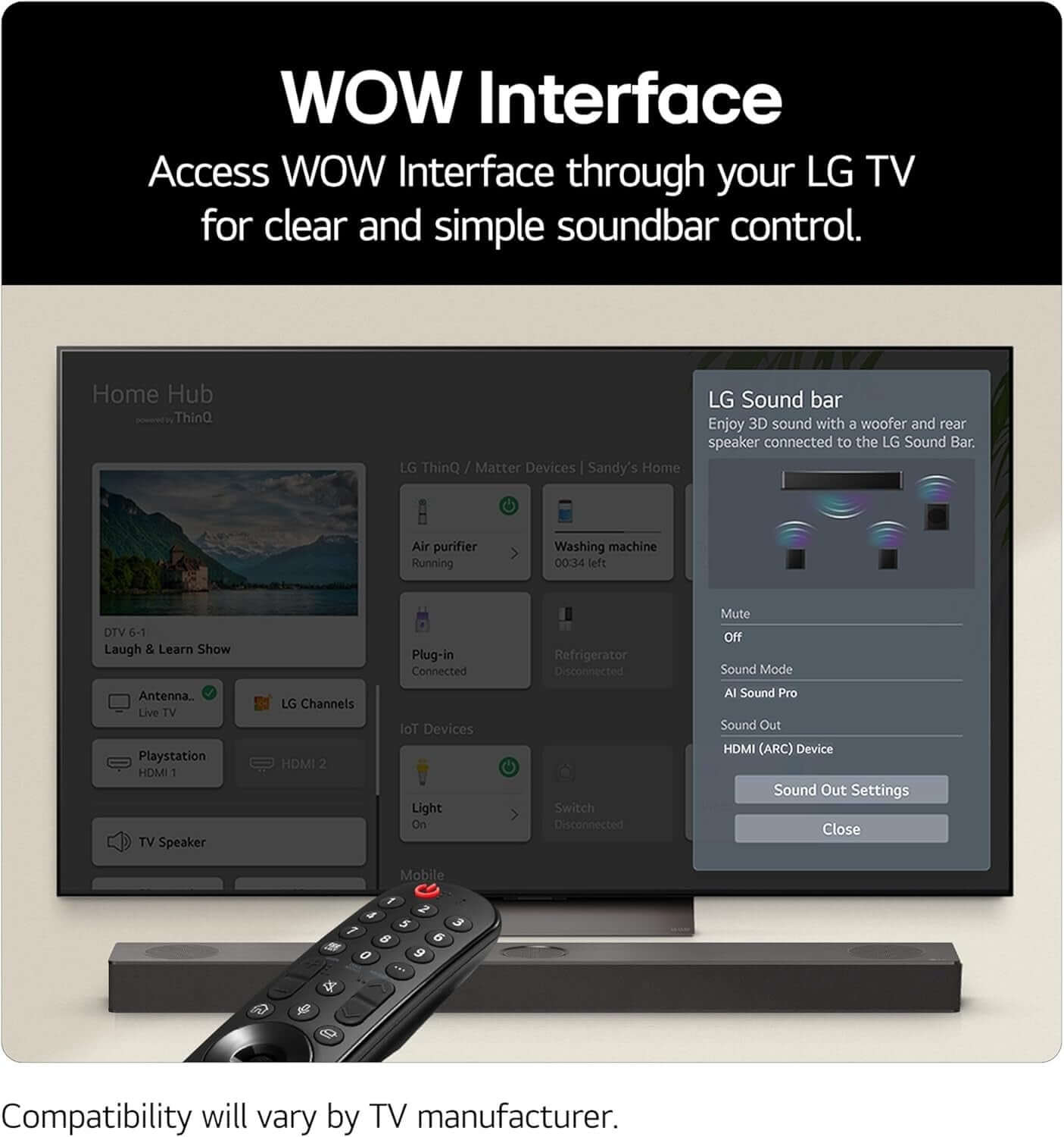 - Pair your soundbar with your compatible LG TV and control it using your TV remote – that's one less thing to find batteries for