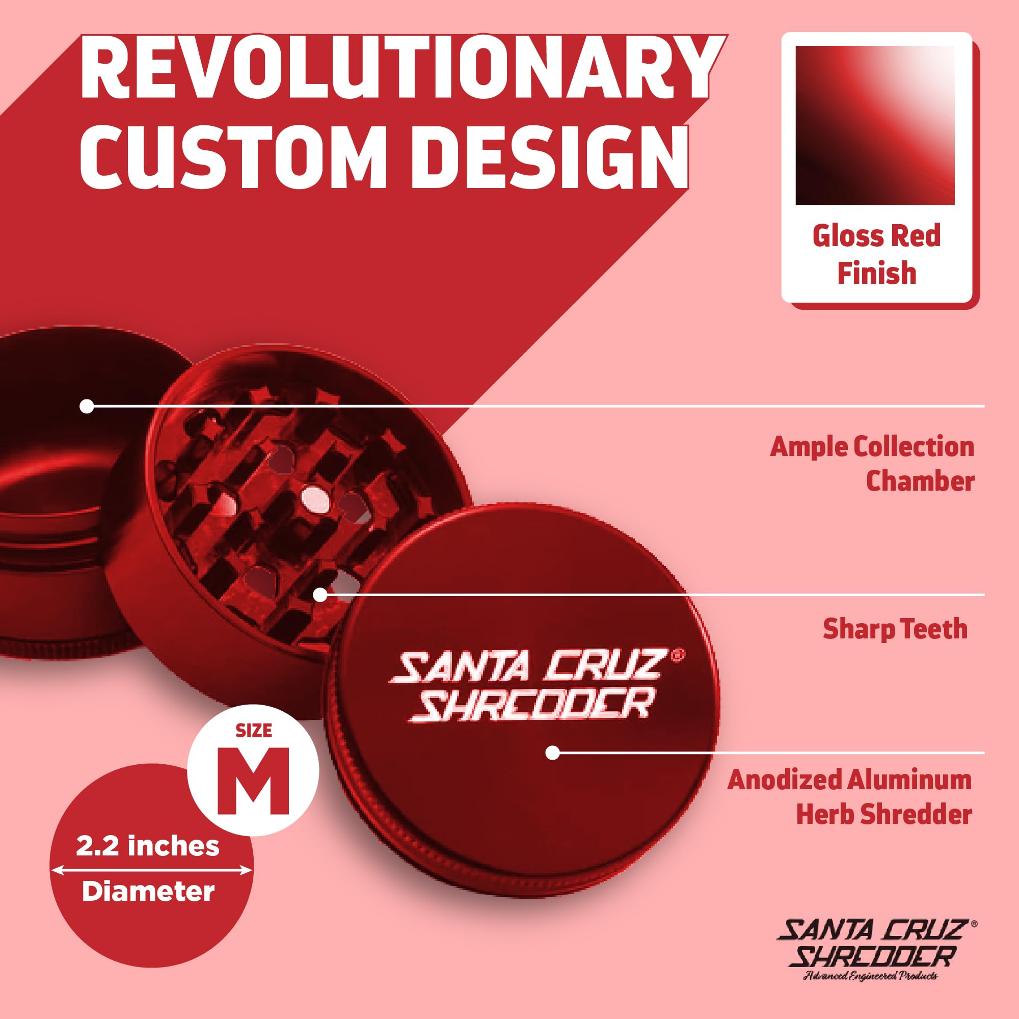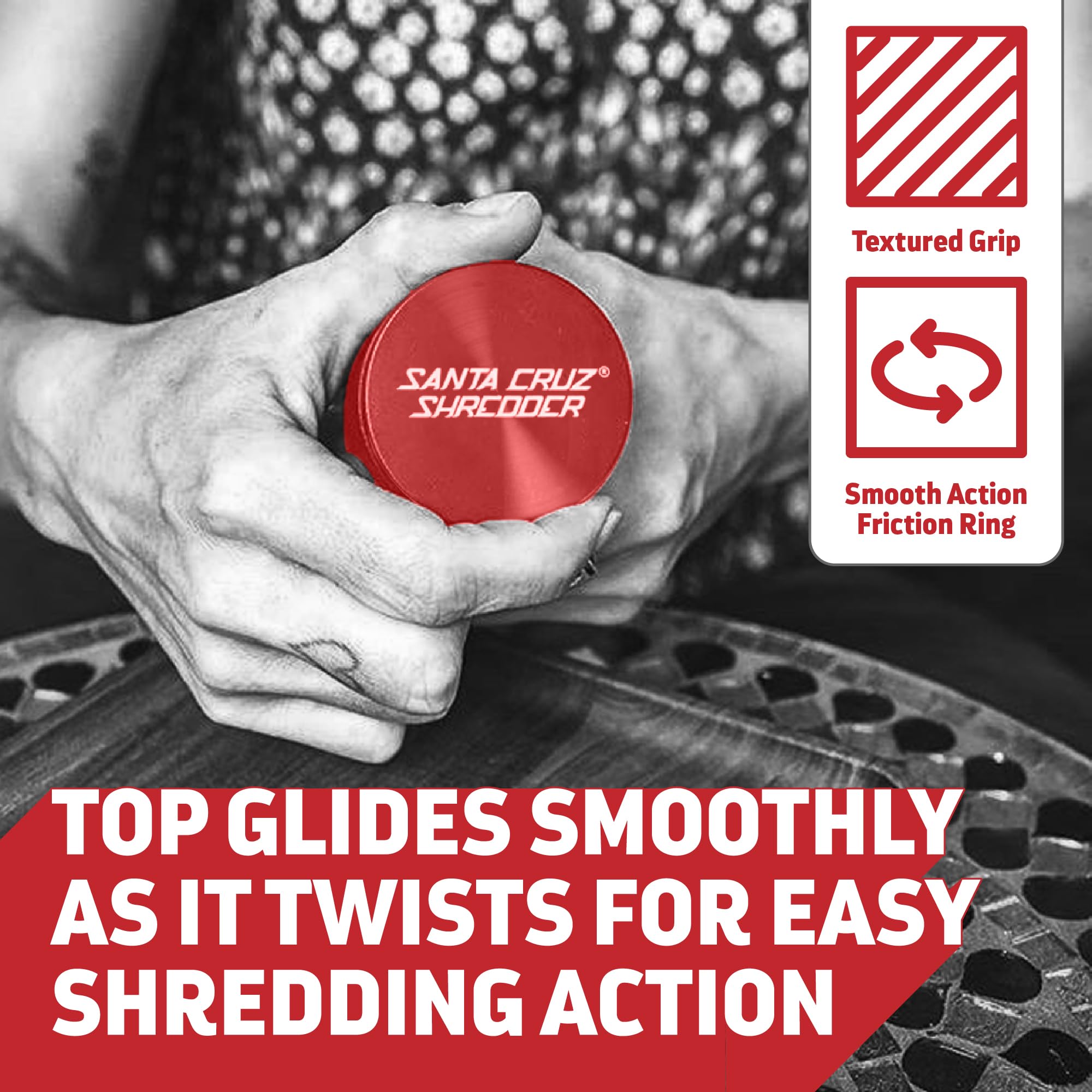 Santa Cruz Shredder Metal Herb Grinder Knurled Top for Stronger Grip 3-Piece Medium 2.2" (Red)