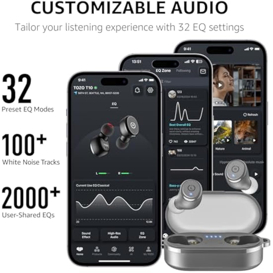 TOZO T10 Wireless Earbuds Bluetooth 5.3 Headphones, App Customize EQ, Ergonomic Desigh, 55H Playtime, Wireless Charging Case, IPX8 Waterproof Powerful Sound in-Ear Headset Grey(New Upgraded)